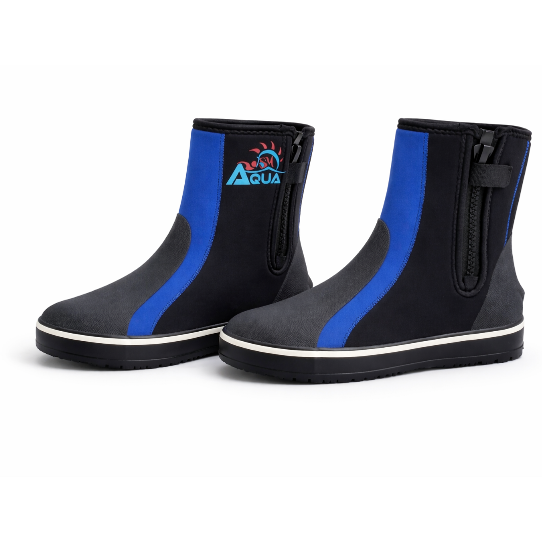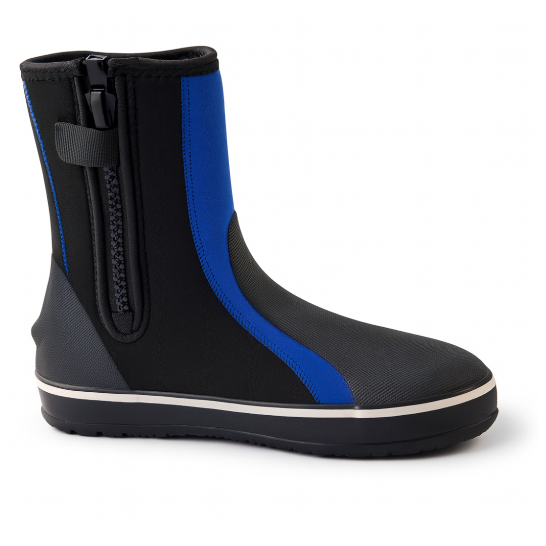 Durable 5mm boots designed for diving, offering excellent warmth, foot protection, and a secure fit with a sturdy sole and zipper for easy wear.